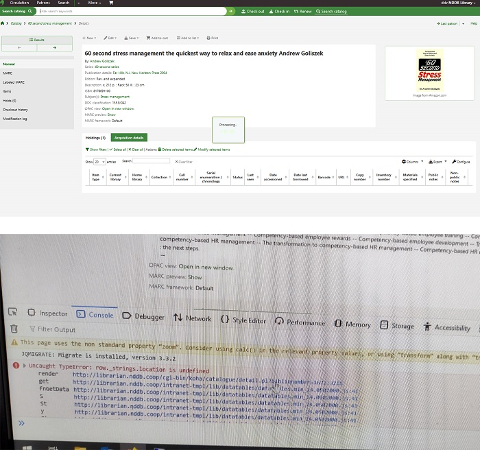 Created attachment 170954 [details] Screenshot After the update of the Koha version, I consistently encounter an error in the item table at cgi-bin/koha/catalogue/detail.pl?biblionumber=. The item details are not displaying the relevant data, and I have attached a screenshot for reference. The specific error message is: let item_type_description = row._strings.location is undefined. To resolve this issue, I have had to contact a developer who modifies the file through Visual Studio. Once the modification is made, the item details display correctly. If there are any patches or updates that could prevent this error in future version updates, that would be greatly appreciated. Thank you. Dr. Dilipkumar Vala