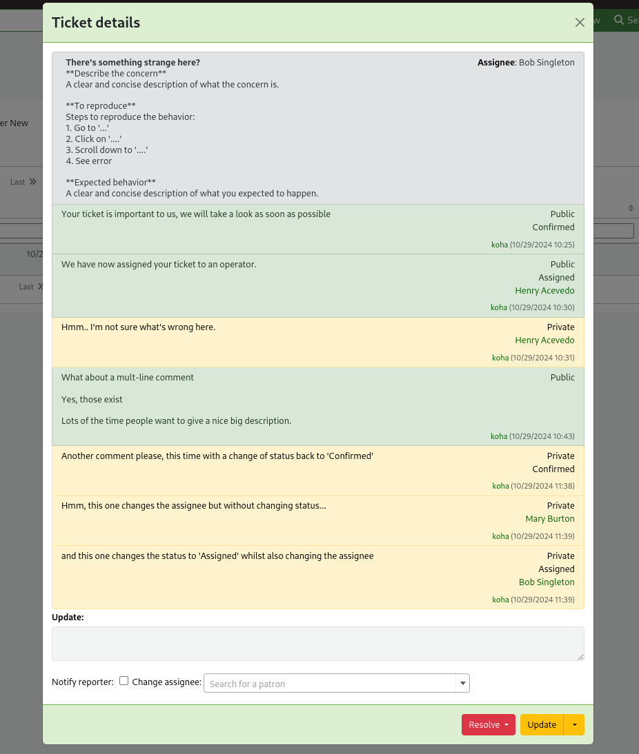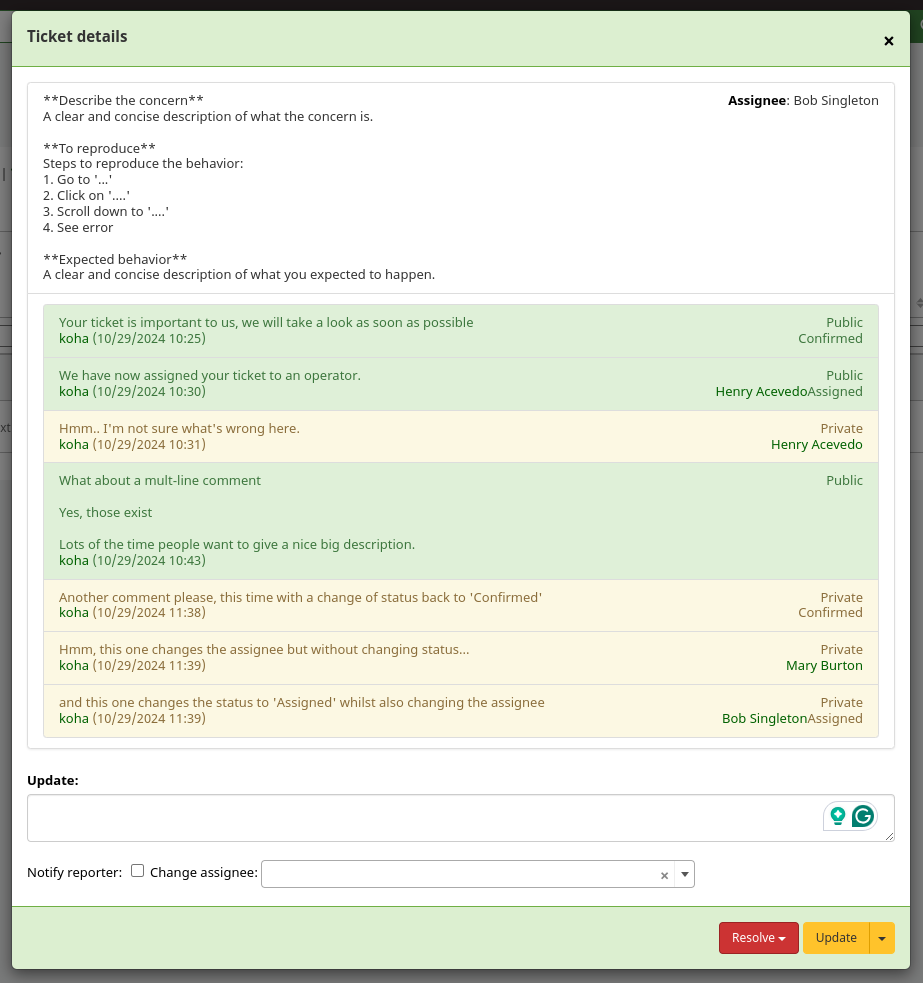 I also noticed there are spaces missing when viewing the updated ticket. - Between the assignee's name and the description (I feel like those two things should not be on the same line?) - Between the "Private" and the text of the update - Between the date of the update and the assignee