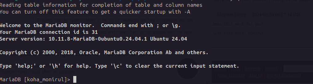 Created attachment 171818 [details] snapshot of terminal During an upgrade of Koha to version 24.05.03-1, the process failed due to a database access error. The upgrade script was unable to connect to the MySQL/MariaDB database, suggesting a potential issue with database permissions or configuration. Steps to Reproduce: Attempt to upgrade Koha-common package to version 24.05.03-1 Run sudo apt-get install mariadb-server Confirm the installation/upgrade process Observed Behavior: The upgrade process fails during the database schema upgrade step An error message indicates that access is denied for the Koha database user Error Message: "DBIx::Class::Storage::DBI::catch {...} (): DBI Connection failed: DBI connect('database=koha_monirul;host=localhost;port=3306','koha_monirul',...) failed: Access denied for user 'koha_monirul'@'localhost' (using password: YES) at /usr/share/koha/lib/Koha/Database.pm line 91. at /usr/share/koha/lib/Koha/Database.pm line 139" Environment: Koha version being upgraded to: 24.05.03-1 Database: MariaDB (version 1:10.11.8-0ubuntu0.24.04.1) Operating System: Ubuntu (likely 24.04 based on package versions)