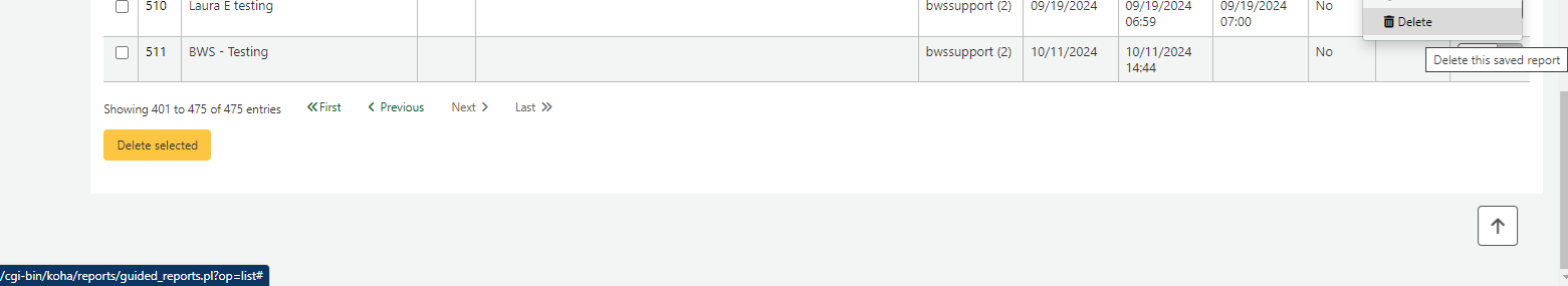 Created attachment 172710 [details] screenshot of the URL for the delete link Very similar to 37328, but this is from the list view of the reports. Clicking on the up arrow and then 'delete' does nothing. The url when you hover over 'delete' ends with /cgi-bin/koha/reports/guided_reports.pl?op=list#