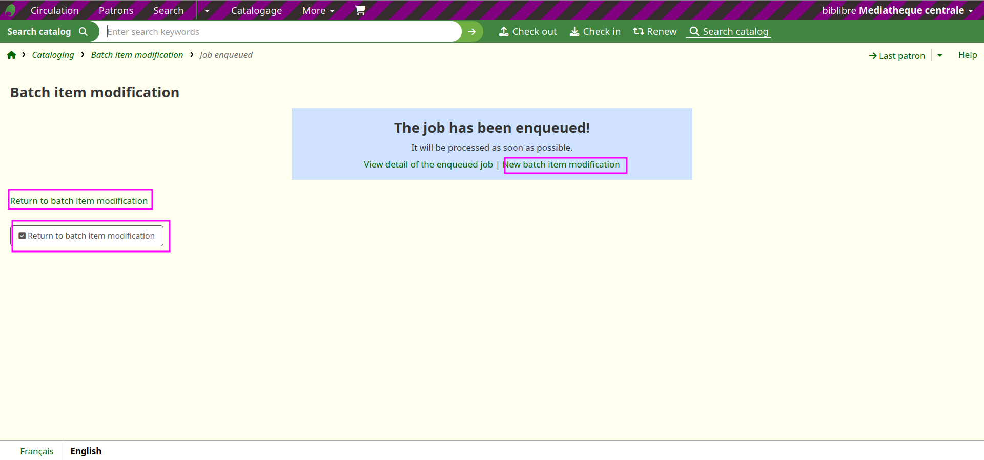 Created attachment 172976 [details] Screenshot batch item modification multiple links After doing a batch item modification, the confirmation page shows multiple links to start a new batch item modification (see the screenshot attached): 1- A blue box saying that the job has been enqueued. This box contains a first link to the batch item modification page. 2- Under the blue box, a first link "Return to batch item modification" 3- Under the previous link, a second link "Return to batch item modification" with some additional skin. All these links are working and going to the same page, but links 2 and 3 are at the same place and only one should be displayed.