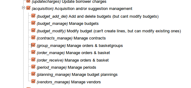 Created attachment 6099 [details] screenshot of acq permissions Ok, to me acq permissions are still very confusing. Please can someone work out which permission is used where and update the permission texts accordingly? budget_add_del Add and delete budgets (but cant modify budgets) budget_manage Manage budgets budget_modify Modify budget (can't create lines, but can modify existing ones) >Still confusing. contracts_manage Manage contracts group_manage Manage orders & basketgroups order_manage Manage orders & basket order_receive Manage orders & basket >Looks all the same? period_manage Manage periods >What periods? planning_manage Manage budget plannings vendors_manage Manage vendors