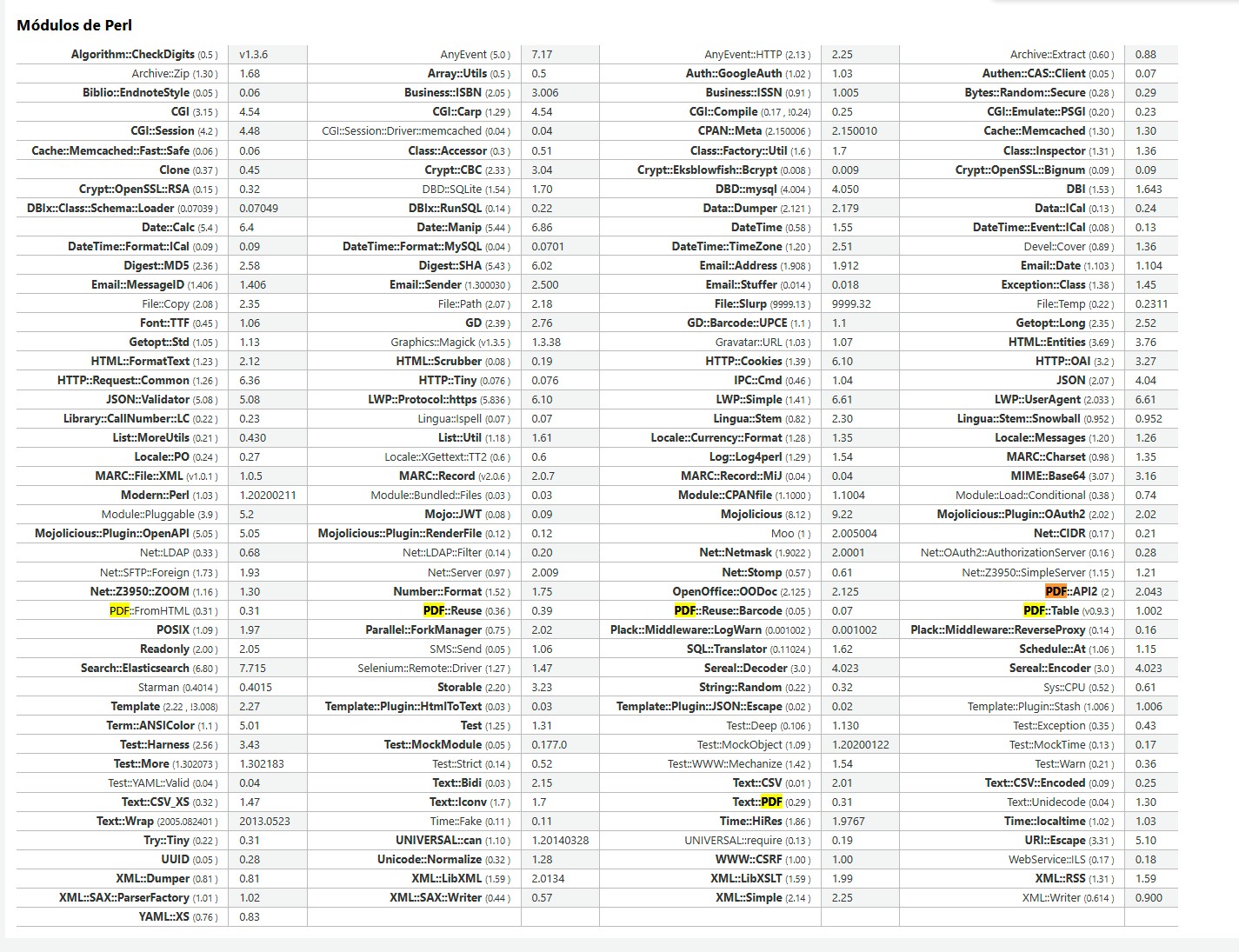 These are the packages comparisson PDF::API2 2.033 cs 2.044 PDF::Table (v0.9.3 ) 0.10.1 vs 1.003 Text::PDF (0.29 ) vs 2.02