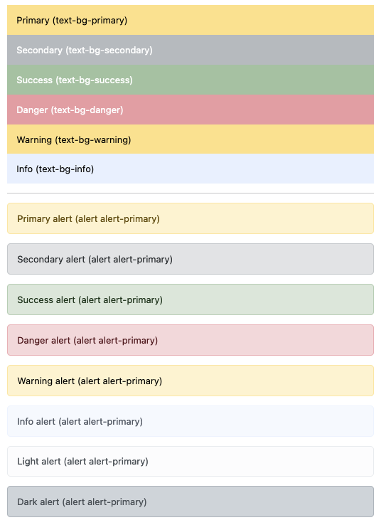 One way of getting a quick look at these changes: Add this markup to the IntranetMainUserBlock HTML customization: <div class="text-bg-primary p-3">Primary (text-bg-primary)</div> <div class="text-bg-secondary p-3">Secondary (text-bg-secondary)</div> <div class="text-bg-success p-3">Success (text-bg-success)</div> <div class="text-bg-danger p-3">Danger (text-bg-danger)</div> <div class="text-bg-warning p-3">Warning (text-bg-warning)</div> <div class="text-bg-info p-3">Info (text-bg-info)</div> <div class="alert alert-primary" role="alert"> Primary alert (alert alert-primary) </div> <div class="alert alert-secondary" role="alert"> Secondary alert (alert alert-primary) </div> <div class="alert alert-success" role="alert"> Success alert (alert alert-primary) </div> <div class="alert alert-danger" role="alert"> Danger alert (alert alert-primary) </div> <div class="alert alert-warning" role="alert"> Warning alert (alert alert-primary) </div> <div class="alert alert-info" role="alert"> Info alert (alert alert-primary) </div> <div class="alert alert-light" role="alert"> Light alert (alert alert-primary) </div> <div class="alert alert-dark" role="alert"> Dark alert (alert alert-primary) </div>