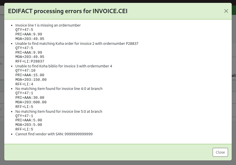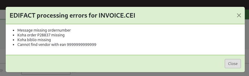 Test plan The simplest way to test this is to comment the database rollback line in the EDI.t unit test and run the unit test to generate some errors and leave them in the database. Then you can view them by enabling the Edifact system preference and navigating to Acquisitions > EDI Messages.