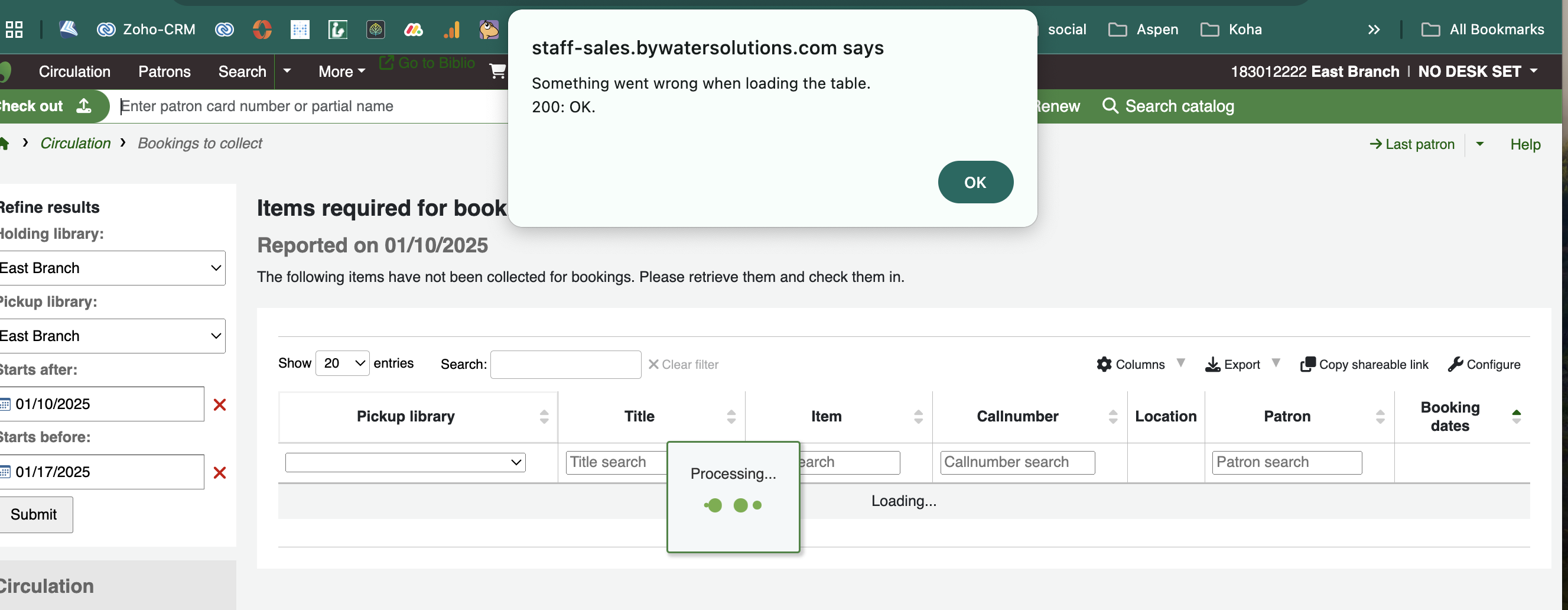 Created attachment 176372 [details] 200 error When loading the bookings to collect report in the circulation module an error appears. 'Something went wrong when loading the table. 200:ok.