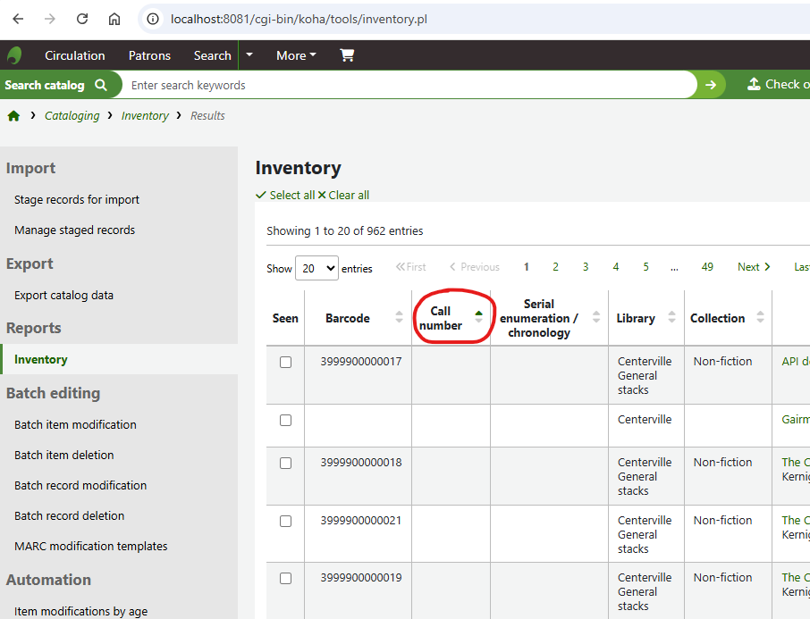 (In reply to Lucas Gass (lukeg) from comment #5) > This now sorts by default on the serial enumeration column: > > inventorydt = $("#inventoryt").kohaTable({ > "pagingType": 'full_numbers', > "bKohaColumnsUseNames": true, > [% IF uploadedbarcodesflag %] > // sort on callnumber > "order": [[ 2, "asc" ]], > [% ELSE %] > // first column contains checkboxes > "columnDefs": [ > { "orderable": false, "searchable": false, > "targets": [ 0 ] } > ], > // 3rd column is callnumber > "order": [[ 2, "asc" ]], > [% END %] Could you provide a bit more information? For me, that doesn't appear to be true. It still sorts on callnumber, because callnumber is still the 3rd column with serial enumeration coming after it. I'll attach a screenshot.