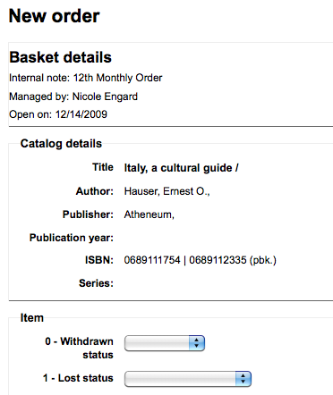 ---- Reported by nengard@gmail.com 2009-12-14 16:26:17 ---- When placing an order from a staged record you are presented with the file [step1], then you click 'add order' then you're presented with the records in the file [step2], then you click 'add order' next to the item and are brought to the order form [step3]. When you click 'Save' on the order form you are brought back to the staged record list [step4] - but it's empty and clicking 'Save' from there causes an error.[step5] Basketnumber required to order from iso2709 file import at /home/nengard/kohaclone/acqui/addorderiso2709.pl line 65. The item is added to the order, but there is no direct way to get back to your basket. See attached images (named in the brackets above). ---- Additional Comments From nengard@gmail.com 2009-12-14 16:26:31 ---- Created an attachment step1 ---- Additional Comments From nengard@gmail.com 2009-12-14 16:26:41 ---- Created an attachment step2 ---- Additional Comments From nengard@gmail.com 2009-12-14 16:26:50 ---- Created an attachment step3 ---- Additional Comments From nengard@gmail.com 2009-12-14 16:27:00 ---- Created an attachment step4 ---- Additional Comments From nengard@gmail.com 2009-12-14 16:27:10 ---- Created an attachment step5 --- Bug imported by chris@bigballofwax.co.nz 2010-05-21 01:21 UTC --- This bug was previously known as _bug_ 3919 at http://bugs.koha.org/cgi-bin/bugzilla3/show_bug.cgi?id=3919 Imported an attachment (id=1682) Imported an attachment (id=1683) Imported an attachment (id=1684) Imported an attachment (id=1685) Imported an attachment (id=1686) Actual time not defined. Setting to 0.0 Setting qa contact to the default for this product. This bug either had no qa contact or an invalid one. The original submitter of attachment 1682 [details] is unknown. Reassigning to the person who moved it here: chris@bigballofwax.co.nz. The original submitter of attachment 1683 [details] is unknown. Reassigning to the person who moved it here: chris@bigballofwax.co.nz. The original submitter of attachment 1684 [details] is unknown. Reassigning to the person who moved it here: chris@bigballofwax.co.nz. The original submitter of attachment 1685 [details] is unknown. Reassigning to the person who moved it here: chris@bigballofwax.co.nz. The original submitter of attachment 1686 [details] is unknown. Reassigning to the person who moved it here: chris@bigballofwax.co.nz.