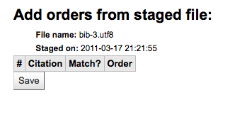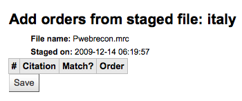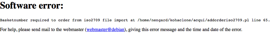 The error appears to have changed. I can add to order but if I click 'Save' I get this error: Software error: Basketnumber required to order from iso2709 file import at /home/nengard/kohaclone/acqui/addorderiso2709.pl line 68. For help, please send mail to the webmaster (webmaster@debian), giving this error message and the time and date of the error. See this screencast: http://www.screencast.com/users/NicoleEngard/folders/Jing/media/51669c68-c566-4e4a-b5f7-5961d4d1cad2 Basically you're stuck in a loop with no way to get to the basket unless you click on the breadcrumbs. What is the point of the 'save' button and how do you get to the basket when you're done ordering from a staged file?