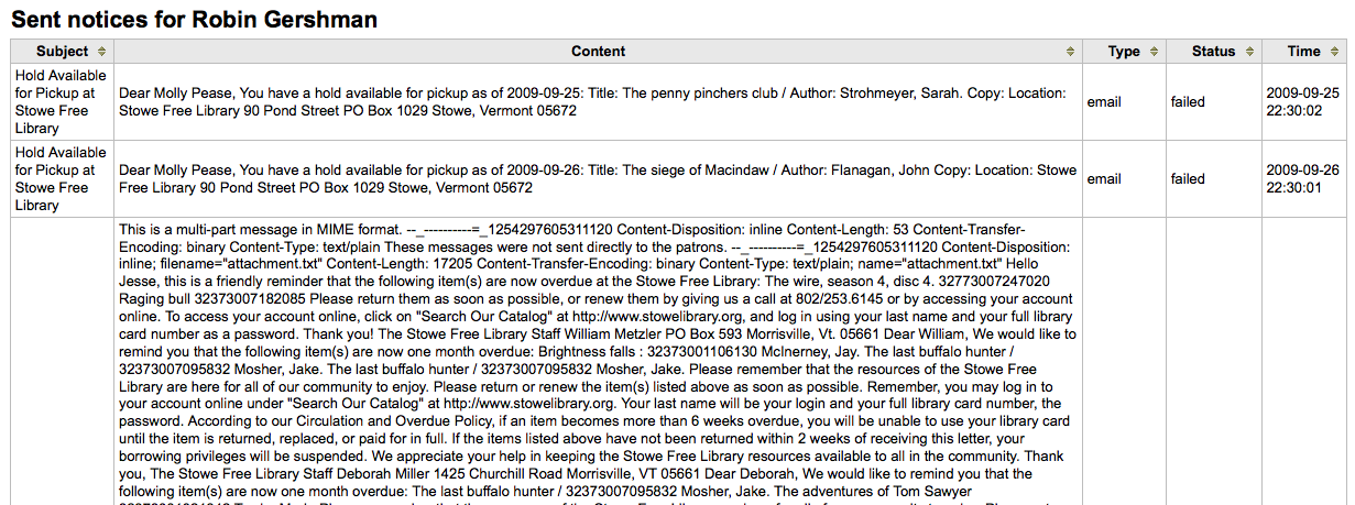 ---- Reported by nengard@gmail.com 2009-12-16 18:54:43 ---- Created an attachment notices tab data On the Patron record there are 2 tabs - one for Messaging (cgi-bin/koha/members/messaging.pl?borrowernumber=1950) that shows the status of all messages sent with the exception of overdue notices. The Notices (cgi-bin/koha/members/notices.pl?borrowernumber=1950) tab I assume should show a log of the overdue notices - but instead it's showing all messages and the text of the messages - which is way way way overkill. This report should show only that an overdue notice was sent and maybe link to the items that were mentioned in the report - but not show the entire email that was sent - it makes the page unreadable. ---- Additional Comments From katrin.fischer@bsz-bw.de 2010-02-08 09:37:38 ---- Created an attachment screenshot This is still a problem in HEAD (3.01.00.111, patched from 3.01.00.61). There are 2 tabs in patron account: - messaging - notices Notices shows all messages from ALL patrons in the system. I like the option to see the text, but its a bit much for a quick overview. I would suggest an option show the text with an additional click, perhaps expand the table cell to show it. Reverted sorting - newest messages at the top - or possibility to sort columns as needed would be a good enhancement too. ---- Additional Comments From barrem01@yahoo.com 2010-05-18 16:22:14 ---- Created an attachment Solution for "all notices" problem? This it the first time I've suggested a patch, so I'd like to have someone confirm I've done it properly. /usr/share/koha/intranet/cgi-bin/members$ diff notices.back.pl notices.pl 52c52 < my $queued_messages = C4::Letters::GetQueuedMessages({$borrowernumber}); --- > my $queued_messages = C4::Letters::GetQueuedMessages({'borrowernumber' => $borrowernumber}); --- Bug imported by chris@bigballofwax.co.nz 2010-05-21 01:21 UTC --- This bug was previously known as _bug_ 3941 at http://bugs.koha.org/cgi-bin/bugzilla3/show_bug.cgi?id=3941 Imported an attachment (id=1696) Imported an attachment (id=1697) Imported an attachment (id=1698) Actual time not defined. Setting to 0.0 Setting qa contact to the default for this product. This bug either had no qa contact or an invalid one. The original submitter of attachment 1696 [details] is unknown. Reassigning to the person who moved it here: chris@bigballofwax.co.nz. The original submitter of attachment 1697 [details] is unknown. Reassigning to the person who moved it here: chris@bigballofwax.co.nz. The original submitter of attachment 1698 [details] [review] is unknown. Reassigning to the person who moved it here: chris@bigballofwax.co.nz.