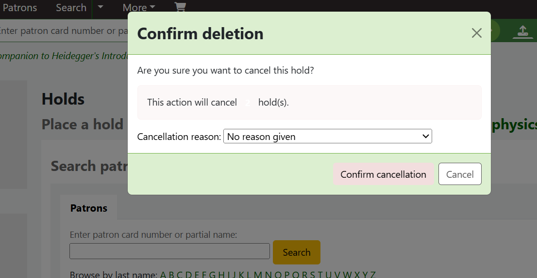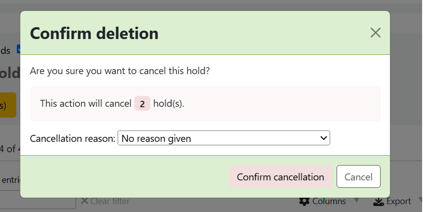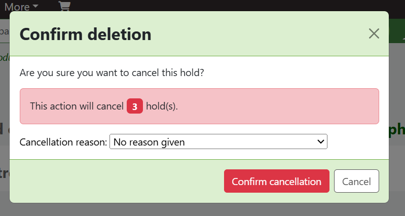 Created attachment 180747 [details] screnshot To recreate: - Go to a bib record and place multiple holds on it - Select multiple holds and click 'Cancel selected (4)' - The Alert says 'This action will cancel 4 hold(s).' - Note that the contrast on the number of holds is very low