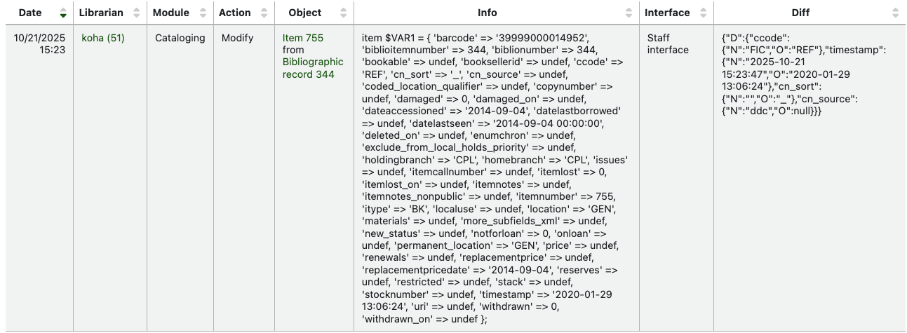 (In reply to Caroline Cyr La Rose from comment #13) > Does anyone have a list of "something that records a diff value"? I'm trying > to document this and I tried editing an item and editing a patron and even > if I unhide the diff column, I only see the regular JSON entry. I tried both > in ktd and a "vintage" install of 25.05.02. Bug 35645 discusses further cleaning up the JSON so it is easier to read. Now that the JSON is viewable we need it to be readable for those of us who are coding-deficient. :)
