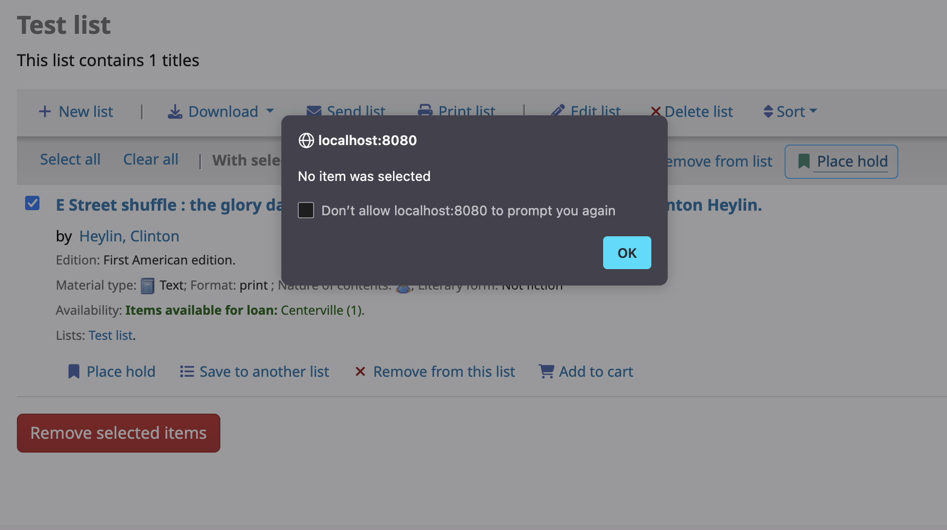 Created attachment 181198 [details] No item selected pop up Issue: I added a book to a new list I created. I selected the book, and clicked "Place hold" and I got a pop up saying nothing is selected. To reproduce: 1. Log in as a user http://localhost:8080 2. Search for a book 3. Click "add to list" (existing or create a new one, doesn't matter) 4. View the list 5. Select the book by ticking the box next to it. 6. Click "Place hold" 7. Receive pop up saying nothing is selected Expected: I should be able to place a hold on the book, as it is selected. Screenshot attached showing that I have selected the box and the pop up is showing I have not. ADDITIONAL NOTES: I have tested this with both private and public lists, and lists that can only be updated by the user, and ones that can be updated by anyone. I have tried with 2 different books, and I can place holds from other places but just not from this list page.