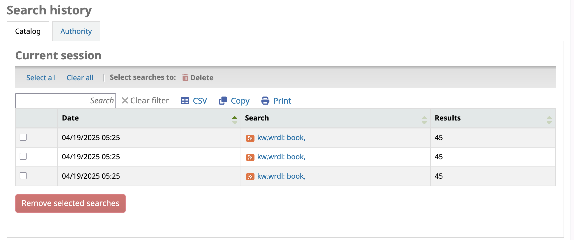Created attachment 181199 [details] A list showing duplicate searches Issue: My search history shows the same search multiple times if I change the sort order. To reproduce: 1. Log in as a user http://localhost:8080 2. Search the catalogue for something 3. On the search results page, choose a different sort order for your results (doesn't matter what, do it a few times, A-Z, Z-A, etc). 4. Go to the search history page http://localhost:8080/cgi-bin/koha/opac-search-history.pl 5. Note that the search shows more than once, one for each time you change the sort order. Expectation: The search should only show once, and not register multiple times due to just changing the order of it. The search history page doesn't indicate this either, so it just looks like the same search over and over. Screenshot attached showing 3 searches all from 5:25. In reality I did one search and just changed the order.