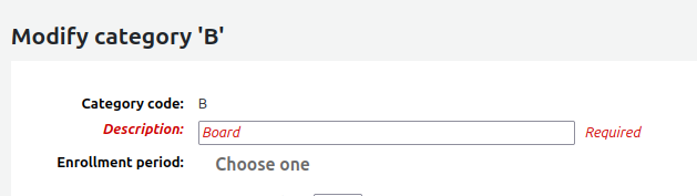 In main, when I go to the patron category form, the required fields' inputs are in red and italic. To recreate: A.1. Go to Administration > Patron categories A.2. Click New category --> Notice the labels for Category code, Description and Category type are in italic (they used to be just red and bold, but not italic) A.3. Type in a code and a description --> Notice that the input is now in red and italic (it used to be black and regular/not italic) B.1. Go to Administration > Patron categories B.2. Click on an existing category --> Notice the description inside the input field is in red and italic (it used to be black and regular/not italic)