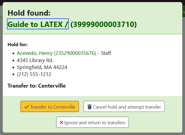 Created attachment 182917 [details] Image of the pop of you get when trying to transfer an item with record-level hold The process of transferring an item which bibliographic record has an unfullfilled hold is strange. I'm not sure how to describe it so here is how to reproduce it and questions: 1. Make a record-level hold for Centerville 2. Go to Circulation -> Transfer 3. Transfer an item from the stage 1 record to Franklin (You are in Centerville) 4. Get a pop up that tells that there is a hold in Centerville and a button "Transfer to Centerville" 5. Click the transfer button 6. You will get a notice that the item was transferred to Franklin 7. Go to the record of the stage 1 8. Notice that the item is not in transfer. You can also check this from branchtransfers table with query SELECT * FROM branchtransfers where itemnumber="put here the itemnumber of the transferred item"; 9. Go to the holds of the record and notice that the hold is in transfer to Centerville Questions: - Why does it want to transfer to the same location as where I am at the moment and not to the location I picked? - Why does it say that item was transferred when it actually was not? - Why does it transfer the hold? I'm not transferring holds when useing the Transfer tool. - Why does the hold get filled when transferring an item? I'm not trying to fill holds, I'm trying to ignore the hold and transfer the item. Other options in the pop up are "Cancel hold and attempt to transfer" and "Ignore and return to transfers". It kind of forces to fill the hold or cancel it and does not let you to transfer the item regardless of the hold.