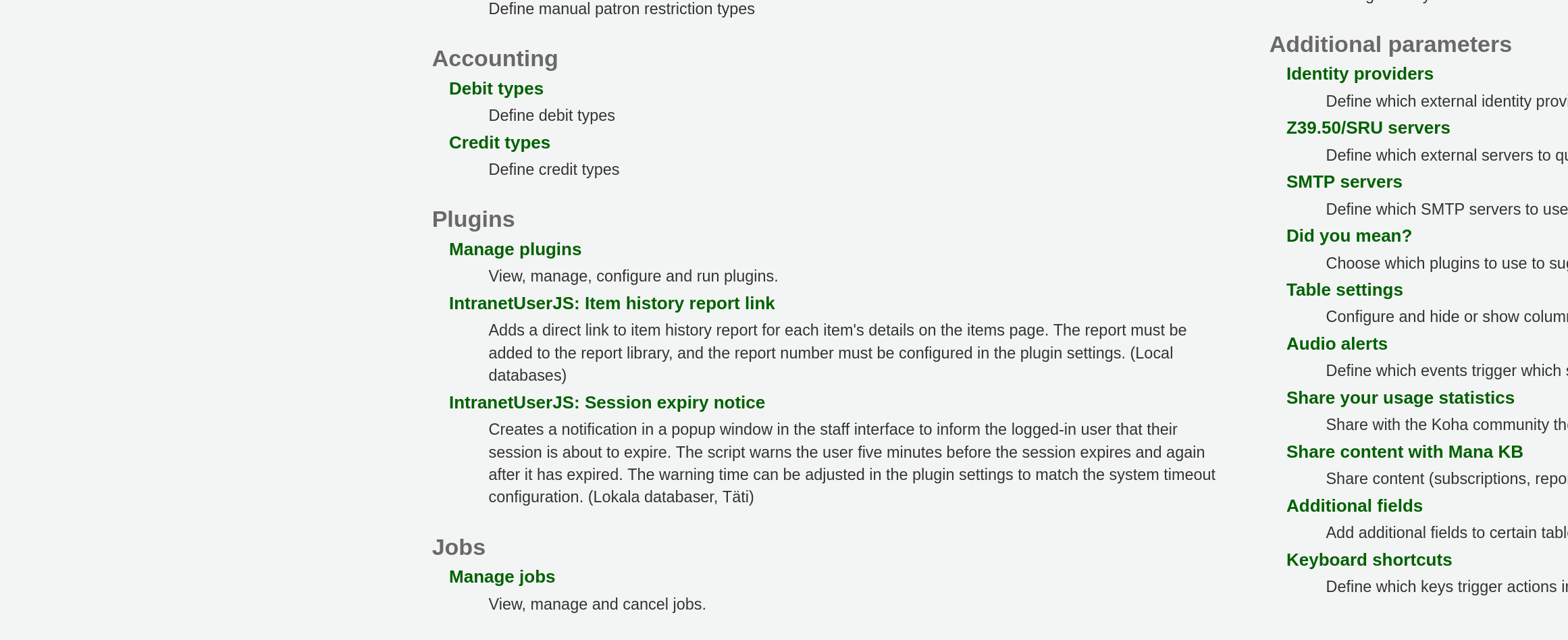We were just about to modify our existing tool plugins and change them to administrative plugins when I noticed this issue. Our goal was to hide access to these plugins from people who have only access to tools page and who could see the tool plugins listed there. We have hidden them with javascript in intranetUsersJs syspref from tools view as a temporary solution. Now that this issue came up that the administrative plugins fill up the administration page, we decided not to convert them unless there is some improvement on how they are listed on admin-home.pl. We have over 20 of these plugins that inject javascript to the intranet just like in the screenshot I took as a demonstration on how they will look like.