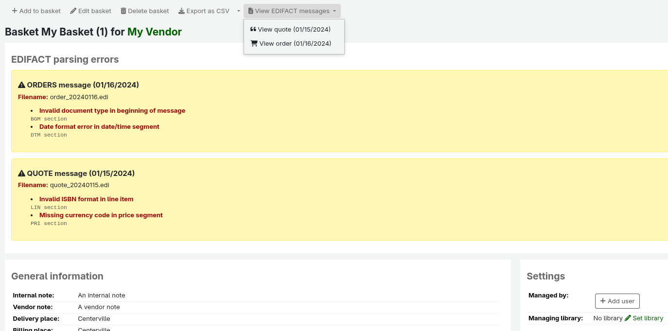 This patch extends the EDIFACT message display functionality from the invoice page to the basket page, providing comprehensive access to EDIFACT messages and error reporting. Features added: - Toolbar buttons for viewing EDIFACT messages (quote/order) - Smart button display: single button for one message type, dropdown for multiple - EDIFACT parsing errors section with inline error display - Errors grouped by message type with detailed information - Conditional display: only shows when relevant data exists Changes: - acqui/basket.pl: Added EDIFACT message and error collection logic - basket.tt: Added toolbar buttons and parsing errors section - Uses existing modal system for raw message display Sponsored-by: Open Fifth <https://openfith.co.uk> Signed-off-by: Hannah Dunne-Howrie <hdunne-howrie@westminster.gov.uk> Signed-off-by: Kyle M Hall <kyle@bywatersolutions.com>