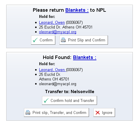 ---- Reported by oleonard@myacpl.org 2010-01-12 17:07:58 ---- Created an attachment Screenshot To reproduce: - Item is on hold for a patron at Branch A. - Item is checked in at Branch B, transfer is confirmed. - Item is checked in again at Branch B, duplicate dialogs are displayed. The first dialog says "Please return [title] : to [branch] Hold for..." and displays the patron's information. No indication that the item should be transfered. The second dialog says "Hold Found: [title] : Hold for..." and displays the patron's information. Below that is the standard "Transfer to [branch]" and the "Confirm hold and transfer" button. See attached image. ---- Additional Comments From oleonard@myacpl.org 2010-01-12 21:00:38 ---- Further investigation shows that two conditions are being met simultaneously: - "WrongTransfer," set at line 283 of returns.pl - "reserved," set at line 327 of returns.pl ---- Additional Comments From oleonard@myacpl.org 2010-02-18 19:20:57 ---- This will also happen if under these circumstances: 1. Item is in-transit between Branch A and Branch B. 2. Item is placed on hold. 3. Item is checked in at Branch C. It makes sense, then, that "WrongTransfer" and "reserved" are both being triggered: Koha expects the item to be heading for a different branch, so it's warning you ("WrongTransfer") that the book should go elsewhere. But it's also noticing the hold, so it's giving you that message too ("reserved"). The "reserved" message is all that is needed because it is a higher priority message. ---- Additional Comments From oleonard@myacpl.org 2010-02-18 19:31:53 ---- A more specific version of that example: 1. Item is in-transit between Branch A and Branch B. 2. Item is placed on hold for patron at Branch C. 3. Item is checked in at Branch C. At step 1, Koha expects the item to be transferred to Branch B. At step 3, Koha expects the item to be sent to be held at Branch C (to fulfill the hold) AND transferred to Branch B (to complete the transfer). ---- Additional Comments From oleonard@myacpl.org 2010-02-18 19:49:50 ---- Even more data: 1. Item from Branch A is checked in at Branch B, automatically transferred to Branch B: +------------+------------+--------------+----------+----------+ | itemnumber | frombranch | datearrived | tobranch | comments | +------------+------------+--------------+----------+----------+ | 1432 | A | NULL | B |NULL | +------------+------------+--------------+----------+----------+ 2. A hold is placed on the item by a patron at Branch C. 3. Item is checked in at Branch D, hold is confirmed. +------------+------------+--------------+----------+----------+ | itemnumber | frombranch | datearrived | tobranch | comments | +------------+------------+--------------+----------+----------+ | 1432 | A | NULL | B | NULL | | 1432 | D | NULL | C | NULL | +------------+------------+--------------+----------+----------+ The item is now simultaneously in-transit to two different branches. Looks like we need automatically cancel any open transfers for an itemnumber if that itemnumber is being transferred for a hold. --- Bug imported by chris@bigballofwax.co.nz 2010-05-21 01:22 UTC --- This bug was previously known as _bug_ 4040 at http://bugs.koha.org/cgi-bin/bugzilla3/show_bug.cgi?id=4040 Imported an attachment (id=1798) Actual time not defined. Setting to 0.0 Setting qa contact to the default for this product. This bug either had no qa contact or an invalid one. The original submitter of attachment 1798 [details] is unknown. Reassigning to the person who moved it here: chris@bigballofwax.co.nz.
