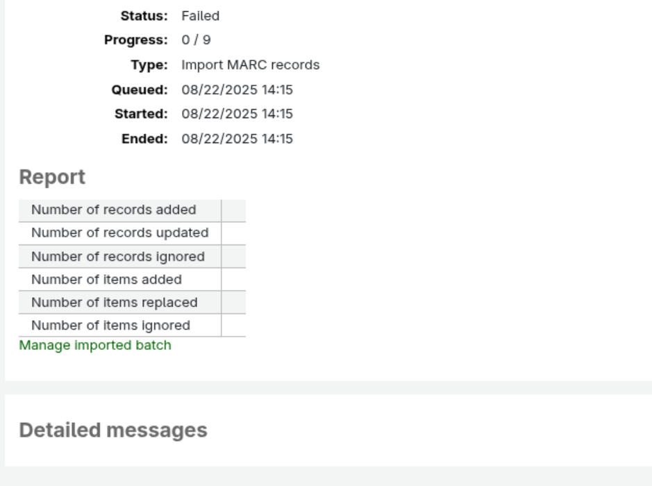 Created attachment 185722 [details] Current display in staff interface If a import fails because of an FK_Constraint issue, there is no helpful information in the interface. It would be very helpful for users if it show that, for example, the branch wasn't valid. I've attached a screenshot of what it looks like in the interface. Example in worker-output.log: DBIx::Class::Storage::DBI::_dbh_execute(): DBI Exception: DBD::mysql::st execute failed: Cannot add or update a child row: a foreign key constraint fails (`koha_kohadev`.`items`, CONSTRAINT `items_ibfk_2` FOREIGN KEY (`homebranch`) REFERENCES `branches` (`branchcode`) ON UPDATE CASCADE) at /usr/share/koha/lib/Koha/Object.pm line 172 Broken FK constraint at /usr/share/koha/lib/Koha/BackgroundJob/MARCImportCommitBatch.pm line 90. DBIx::Class::Storage::DBI::_dbh_execute(): DBI Exception: DBD::mysql::st execute failed: Cannot add or update a child row: a foreign key constraint fails (`koha_kohadev`.`items`, CONSTRAINT `items_ibfk_2` FOREIGN KEY (`homebranch`) REFERENCES `branches` (`branchcode`) ON UPDATE CASCADE) at /usr/share/koha/lib/Koha/Object.pm line 172 Broken FK constraint at /usr/share/koha/lib/Koha/BackgroundJob/MARCImportCommitBatch.pm line 90. DBIx::Class::Storage::DBI::_dbh_execute(): DBI Exception: DBD::mysql::st execute failed: Cannot add or update a child row: a foreign key constraint fails (`koha_kohadev`.`items`, CONSTRAINT `items_ibfk_2` FOREIGN KEY (`homebranch`) REFERENCES `branches` (`branchcode`) ON UPDATE CASCADE) at /usr/share/koha/lib/Koha/Object.pm line 172 Broken FK constraint at /usr/share/koha/lib/Koha/BackgroundJob/MARCImportCommitBatch.pm line 90.