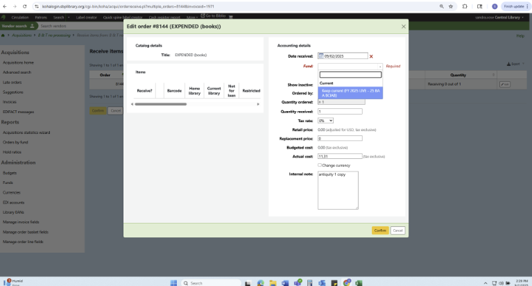 Created attachment 186059 [details] Display of order edit We are an early adopter to 25.05.02 and we're unable to select the correct fund when paying invoices. This refers to paying paper invoices we receive since as this Baker &Taylor example. Previously, we were given the option to select the fund, and since we have two active funds now due to closing out the fiscal year, we are only able to see one of the active funds (unfortunately not the fund we need to pay this invoice). I checked acquisitions permissions, and Sandra has full ACQ permissions.