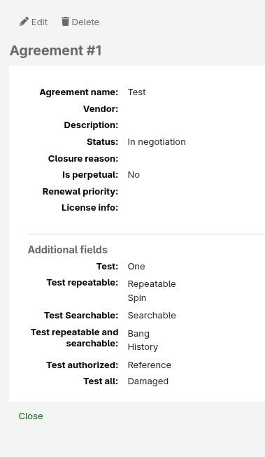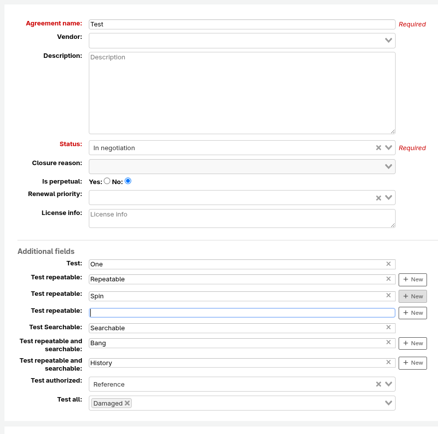 Fantastic work Martin! These changes make adding, editing, and viewing the additional fields for Vue enabled modules much more consistent and usable. Testing notes (using KTD): 1. Apply patches (and dependencies) 2. Rebuild the JavaScript (yarn js:build or yarn build(?)) 3. Restart everything: restart_all 4. Define some additional fields for vendors (Administration > Additional parameters > Additional fields > Acquisitions > E-resource management > Vendors (aqbooksellers:vendor)). Create a combination of additional fields: . Single field . Repeatable field . Field using authorized values (YES_NO) . Repeatable field using authorized values (YES_NO) . Searchable . Repeatable and searchable 5. Define some additional fields for ERM agreements (Administration > Additional parameters > Additional fields > Acquisitions > Vendors > Agreements (erm_agreements)) . Single field . Repeatable field . Field using authorized values (YES_NO) . Repeatable field using authorized values (YES_NO) . Searchable . Repeatable and searchable 6. Test additional fields for the ERM module: . Enable the ERM module (ERMModule system preference) . Create an agreement and add some additional fields . View the agreement with the additional fields . View the list of agreements 7. Test additional fields for vendors: . Create a new vendor and add some additional fields (Acquisitions > + New vendor) . View the vendor information with additional fields . View the list of vendors