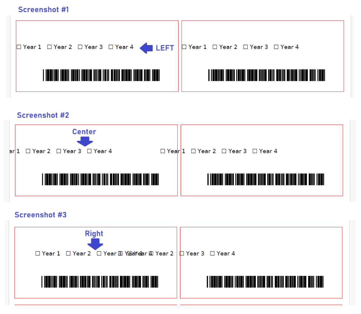 Created attachment 189625 [details] UX screenshot Version: 24.11.10 (LTS) layout_xml (left aligned text field) <opt guide_box="1" guide_grid="0" page_side="F" units="POINT"> <barcode height_scale="0.008" llx="35" lly="10" print="1" type="CODE39" width_scale="0.8" /> <text>☐ Year 1 ☐ Year 2 ☐ Year 3 ☐ Year 4</text> <text font="H" font_size="10" llx="0" lly="75" text_alignment="L" /> </opt> When text_alignment="L" - output is OK (Screenshot #1) When text_alignment="C" - output is wonky (Screenshot #2) When text_alignment="R" - output is wonky (Screenshot #3) NOTE: all other settings being same for L, C and R This seems to fix the issue (I may have missed outlier / edge cases) diff /usr/share/koha/lib/C4/Patroncards/Patroncard.pm /usr/share/koha/lib/C4/Patroncards/Patroncard.pm.new 325c325 < ($Tx, $Tw) = text_alignment($origin_llx, $self->{'width'}, $lly_text_attr * $self->{'unitvalue'}, $string_width, $line, $text_attribs->{'text_alignment'}); --- > ($Tx, $Tw) = text_alignment($origin_llx, $self->{'width'}, $llx_text_attr * $self->{'unitvalue'}, $string_width, $line, $text_attribs->{'text_alignment'}); diff /usr/share/koha/lib/C4/Patroncards/Lib.pm /usr/share/koha/lib/C4/Patroncards/Lib.pm.new 62c62 < $Tx = ($text_box_width - $string_width) + (($origin_llx - $text_llx) / 2); --- > $Tx = ($text_box_width - $string_width) + ($origin_llx - $text_llx); Can someone pls verify this?