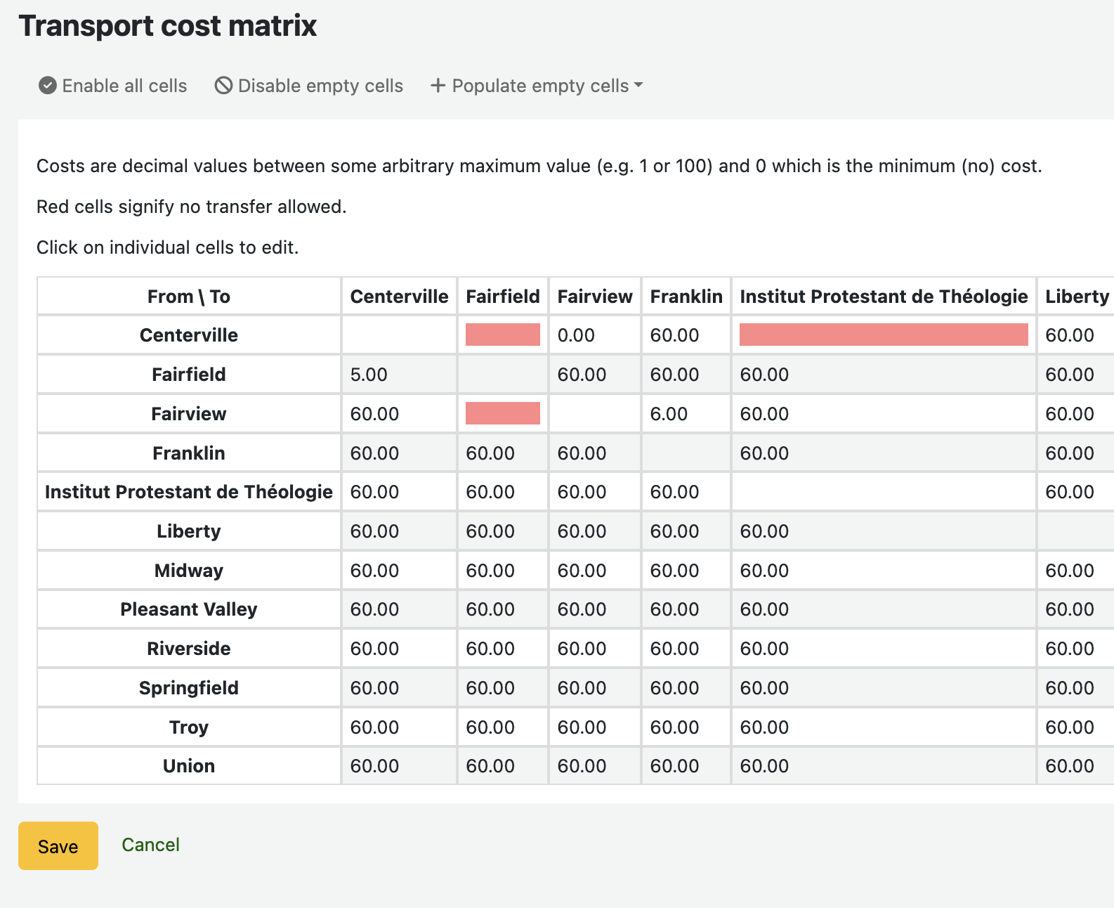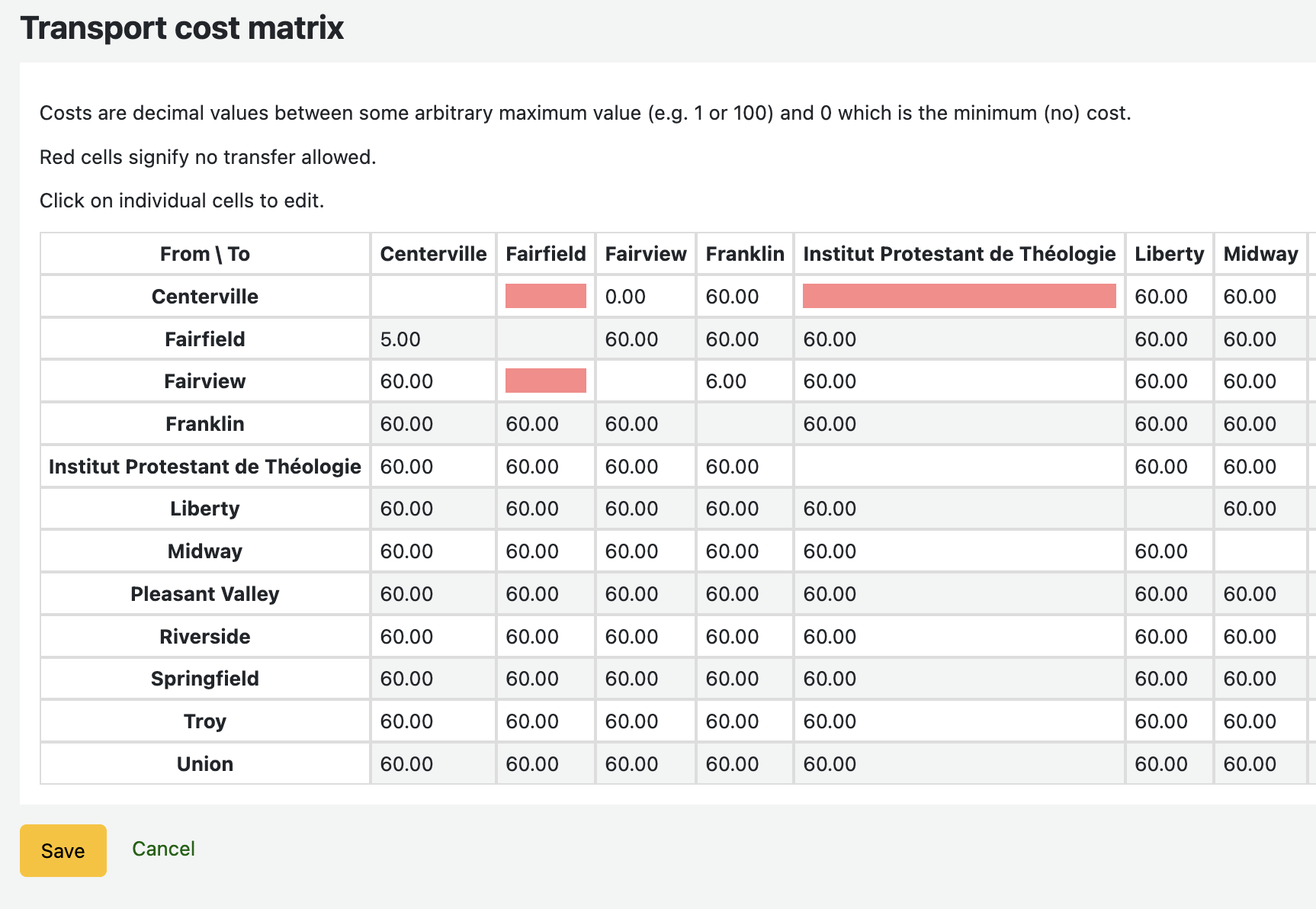 I've not used the transport cost matrix before, so am reluctant to sign off - it appears to work as expected: the new actions work, I can add values, and can also edit individually. One thing I noted is that there is the text above the table saying "Red cells signify no transfer allowed.", which is still correct. However, the transfer for the same library (for example, Centerville to Centerville) is either white or grey, where previously it was red.