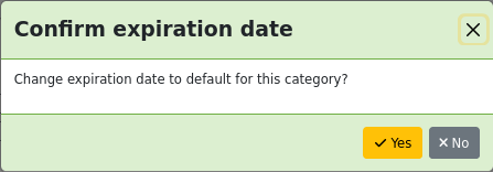 Created attachment 190200 [details] [review] Bug 41361: Fix markup in category code confirmation modal This patch fixes the markup in the modal, introduced by Bug 32581, asking whether to update the patron's expiration date when changing the patron category. The markup needs to be updated to conform with Bootstrap 5. To test, apply the patch and go to Patrons. - Search for any patron and edit it. - Scroll down to the "Library management" section. - Change the category. - You should see a confirmation modal: "Confirm expiration date" - Test each of the controls to confirm that they work correctly: The "X" close button, the "Yes" and "No" buttons. Sponsored-by: Athens County Public Libraries Signed-off-by: David Nind <david@davidnind.com> Signed-off-by: Marcel de Rooy <m.de.rooy@rijksmuseum.nl>