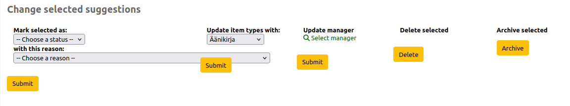 Created attachment 191852 [details] Change selected suggestions section Buttons, fields and labels on Change selected suggestions section on suggestion/suggestion.pl page are a bit wonky. See attached picture.