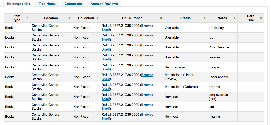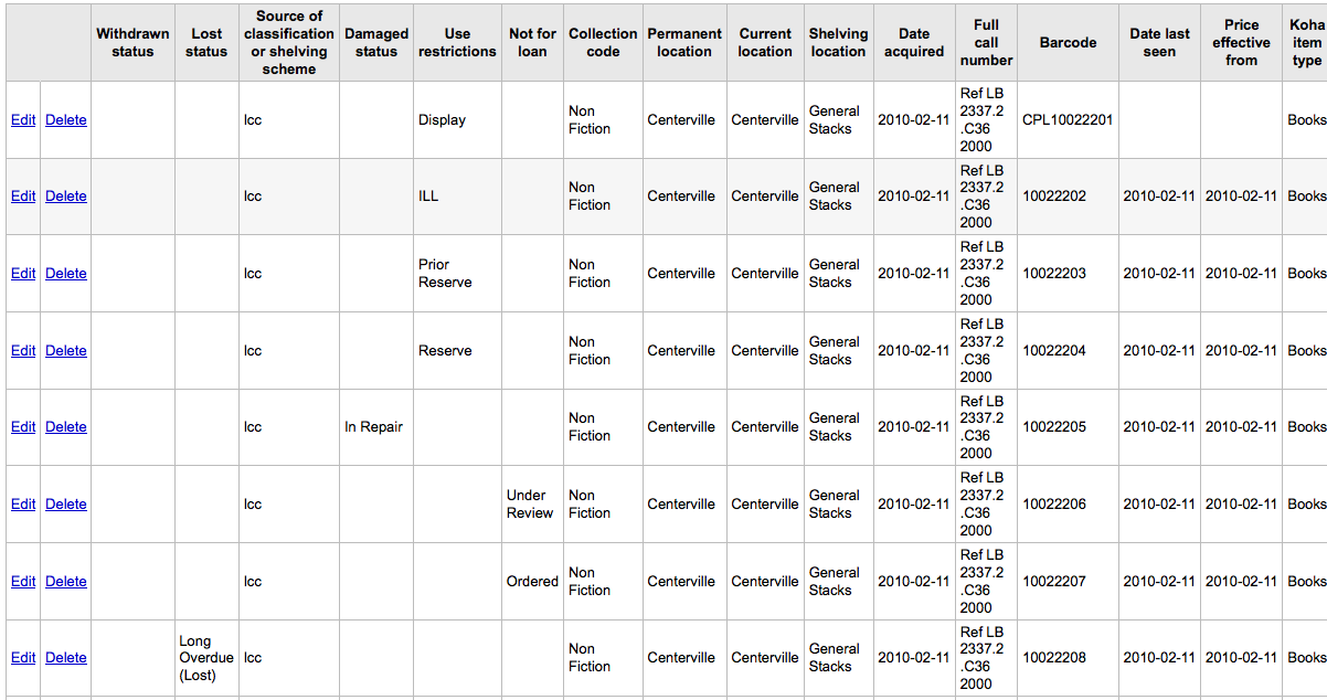 ---- Reported by nengard@gmail.com 2010-02-12 23:15:26 ---- Created an attachment items in opac (w/out status) When in the OPAC the authorized values for item statuses are not appearing. See the attached images. I set several items to different types and put the type in the public notes field so I could keep track of them all. These values all came from an authorized value field - in which I entered text in the OPAC display field ... but it's not displaying. If the authorized values allow for me to enter a value for the OPAC then it should appear in the OPAC. Examples included values in: RESTRICTED LOST NOT_LOAN DAMANGED ---- Additional Comments From nengard@gmail.com 2010-02-12 23:15:47 ---- Created an attachment items in staff w/ status ---- Additional Comments From nengard@gmail.com 2010-02-12 23:16:06 ---- Created an attachment items in staff w/ status (pt2) ---- Additional Comments From oleonard@myacpl.org 2010-02-22 21:42:21 ---- 1. Lost: this status displays correctly but doesn't display the authorized value description. My guess is that this is by design: What use is it to the patron to know in what sense an item is lost? On the other hand, that's what the "hidelostitems" system preference is for--if patrons don't need to know information about lost stuff, just hide it. So maybe there is a good argument to display the authorized value if a library has chosen to leave "hidelostitems" off. 2. Damaged: Same as Lost, status displays correctly but doesn't display the authorized value description. I could see this argued either way. I think the key is asking what use the information might be to a patron, for instance whether knowing more details tells the patron whether it is worth placing a hold on the item. 3. Not for loan: status displays and shows authorized value correctly. 4. Use Restrictions: Doesn't display at all. This makes sense, as setting a value in "use restrictions" doesn't actually do anything. There is no logic built into Koha to change handling of an item with such a value present. What should it do? ---- Additional Comments From nengard@gmail.com 2010-02-23 12:12:32 ---- The should all show the authorized values - otherwise why bother having them? In particular Use Restrictions - I have an academic library who want the patrons to see any restrictions on use they might apply - and why have a field and an authorized value if nothing it doesn't do anything? :) Now - if http://bugs.koha.org/cgi-bin/bugzilla3/show_bug.cgi?id=4237 goes through then at least the library have a way to communicate item statuses with patrons - but right now I have librarians asking how to actually show the status they want. ---- Additional Comments From oleonard@myacpl.org 2010-02-23 13:24:03 ---- "Why have a field and an authorized value if nothing it doesn't do anything?" Exactly--let's get rid of the authorized value if putting data in it has no effect on functionality. ---- Additional Comments From nengard@gmail.com 2010-02-23 14:07:28 ---- I don't need functionality - I just need it to display - it's a valid field - and it should display any statuses that libraries want to put in there! :) ---- Additional Comments From oleonard@myacpl.org 2010-04-13 18:55:48 ---- Created an attachment Proposed fix Adds output of "RESTRICTED" authorized value (an item's "Use Restriction" status) ---- Additional Comments From gmcharlt@gmail.com 2010-04-16 11:22:53 ---- (In reply to comment #4) > The should all show the authorized values - otherwise why bother having them? For staff display, not OPAC. ---- Additional Comments From nengard@gmail.com 2010-04-20 12:56:40 ---- Well, I've had a lot of libraries I've trained ask how to get theses to show in the OPAC - so I'm going to say the bad word - maybe we should have a sys pref on whether to show the statuses in staff only or in the staff and OPAC ---- Additional Comments From oleonard@myacpl.org 2010-05-04 15:44:06 ---- (From update of attachment 1806 [details]) Looks like this has been made obsolete by the work for http://bugs.koha.org/cgi-bin/bugzilla3/show_bug.cgi?id=4396 which adds a separate template for status handling. Will have to re-work. --- Bug imported by chris@bigballofwax.co.nz 2010-05-21 01:24 UTC --- This bug was previously known as _bug_ 4173 at http://bugs.koha.org/cgi-bin/bugzilla3/show_bug.cgi?id=4173 Imported an attachment (id=1884) Imported an attachment (id=1885) Imported an attachment (id=1886) Imported an attachment (id=1887) Actual time not defined. Setting to 0.0 Setting qa contact to the default for this product. This bug either had no qa contact or an invalid one. CC member thehaven104@gmail.com does not have an account here The original submitter of attachment 1884 [details] is unknown. Reassigning to the person who moved it here: chris@bigballofwax.co.nz. The original submitter of attachment 1885 [details] is unknown. Reassigning to the person who moved it here: chris@bigballofwax.co.nz. The original submitter of attachment 1886 [details] is unknown. Reassigning to the person who moved it here: chris@bigballofwax.co.nz. The original submitter of attachment 1887 [details] [review] is unknown. Reassigning to the person who moved it here: chris@bigballofwax.co.nz.
