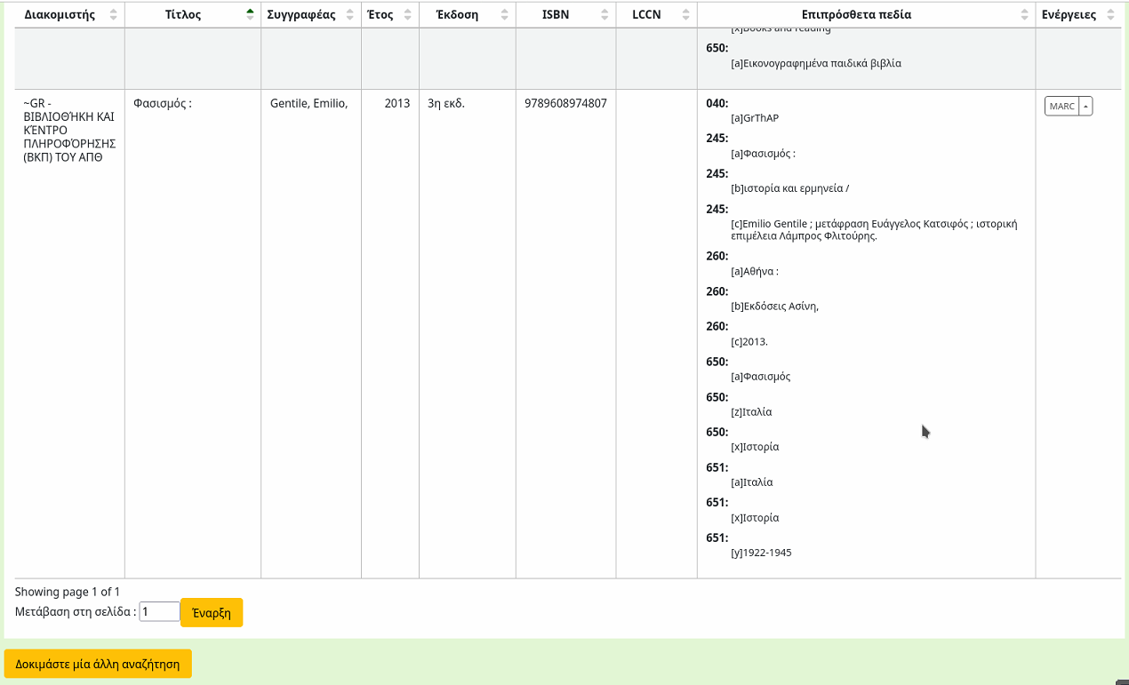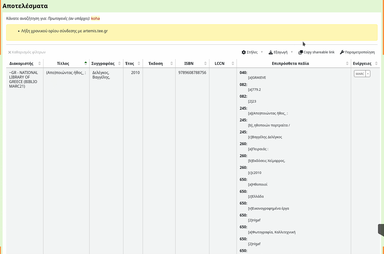 Thank you for the time and attention! I failed to notice the pointer to the error in the logs. I beg to differ however, the issue is neither invalid nor resolved. AdditionalFieldsInZ3950Result value is "022$a, 040$a, 082$a2, 092$a2, 245$abc, 247$a, 260$abc, 440$a, 500a, 600$a, 650$avxyz2, 651$avxyz2". Which part is erroneous, and why? Are any of these fields noted in a do-not-use list somewhere in koha documentation? If indeed the value above was an "invalid expression", then we wouldn't get any results. Please note attached examples of result pages. It seems that some servers/targets include garbage/erroneous data in their replies, and koha is unable to report the fact, recover and proceed to the next server in the list. In order to make things clearer, one may * make koha report on the targets sucessfully queried, * make koha not stumble when encountering erroneous replies from z39.50 targets * make koha note in the logs the target raising the error. You may recreate the error by querying LOC for title "koha" or keyword "koha", using the AdditionalFieldsInZ3950Result value above.