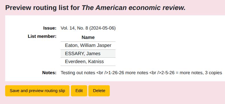 Created attachment 193148 [details] routing list example with html To replicate: 1. Be sure the RoutingSerials system preference is enabled. 2. Find a serial with a subscription. Click on Edit Routing List. 3. Add some recipients and add some notes. Be sure the notes are formatted something like this line breaks: Testing out notes 1-26-26 more notes 2-5-26 = more notes, 3 copies 4. Save. Notice the text of the note appears in one line with the html notation: Notes:Testing out notes <br />1-26-26 more notes <br />2-5-26 = more notes, 3 copies 5. Click on Save and preview routing slip. Notice the text with the html notation carries through to the print preview display. I would expect the html notation to not display.