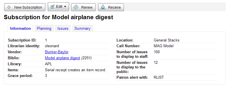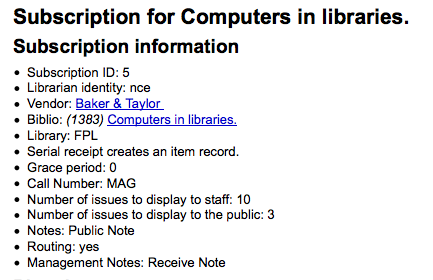 ---- Reported by nengard@gmail.com 2010-02-18 20:27:39 ---- Created an attachment serial information is cluttered When viewing a serial the top of the screen has too much information and it's hard to sort through it all. Maybe splitting it into 2 columns (like the patron info pages) would make it a bit easier to navigate/read. --- Bug imported by chris@bigballofwax.co.nz 2010-05-21 01:24 UTC --- This bug was previously known as _bug_ 4223 at http://bugs.koha.org/cgi-bin/bugzilla3/show_bug.cgi?id=4223 Imported an attachment (id=1919) Actual time not defined. Setting to 0.0 The original submitter of attachment 1919 [details] is unknown. Reassigning to the person who moved it here: chris@bigballofwax.co.nz.