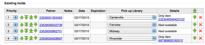 ---- Reported by nengard@gmail.com 2010-02-19 17:04:36 ---- Created an attachment holds When on the list of holds on a bib record I love the new arrow images! My question is why do I need an arrow to move the end of the list and an arrow to toggle lowest priority? they do the same thing - as far as I can tell. ---- Additional Comments From kyle.m.hall@gmail.com 2010-02-19 18:39:33 ---- (In reply to comment #0) > Created an attachment [details] > holds > > When on the list of holds on a bib record I love the new arrow images! My > question is why do I need an arrow to move the end of the list and an arrow to > toggle lowest priority? they do the same thing - as far as I can tell. > Toggle lowest priority keeps that reserve request at the bottom of the list *at all times*. Even if more reserve requests are made, any reserve requests with Lowest Priority set stay at the bottom. For example, we have home-bound patrons that are allowed to keep books out for months at a time. It would not be fair to other patrons if a home-bound patron were able to check out a brand new book and keep it for months. For this reason, the home-bound patron's reserve request would stay at the bottom of the queue until everyone else who wanted to read that book has already done so. ---- Additional Comments From nengard@gmail.com 2010-02-19 19:01:49 ---- okay - we might want to use a different image if we can think of one to note that it will stick as the last? ---- Additional Comments From kyle.m.hall@gmail.com 2010-02-19 20:10:18 ---- (In reply to comment #2) > okay - we might want to use a different image if we can think of one to note > that it will stick as the last? > That sounds like a good idea. I think it would be good to add an option to set reserves for a given borrower category to be automatically set to lowest priority. ---- Additional Comments From oleonard@myacpl.org 2010-02-22 20:13:54 ---- I was thinking of a push-pin icon. Does "Pin lowest priority" convey the correct meaning? ---- Additional Comments From nengard@gmail.com 2010-02-22 20:26:39 ---- a push pin does indicate 'stay in place' to me - is there anyway to make the pin have an arrow on it pointing down? or is that too much to fit in such a small place? a pin with a tooltip should be fine ---- Additional Comments From kyle.m.hall@gmail.com 2010-02-23 13:20:16 ---- Created an attachment Lowest priority icon with push pin added. How does this look? ---- Additional Comments From oleonard@myacpl.org 2010-02-23 13:22:02 ---- Kyle I think that's the right idea but I don't think it's going to scale down well--the pin is going to turn into a dot. ---- Additional Comments From kyle.m.hall@gmail.com 2010-02-23 14:06:35 ---- (In reply to comment #7) > Kyle I think that's the right idea but I don't think it's going to scale down > well--the pin is going to turn into a dot. > I agree. I could scale all the icons up a bit. All the originals are SVGs. It would take up a bit more real estate, but not too much. --- Bug imported by chris@bigballofwax.co.nz 2010-05-21 01:24 UTC --- This bug was previously known as _bug_ 4230 at http://bugs.koha.org/cgi-bin/bugzilla3/show_bug.cgi?id=4230 Imported an attachment (id=1921) Imported an attachment (id=1922) Actual time not defined. Setting to 0.0 Setting qa contact to the default for this product. This bug either had no qa contact or an invalid one. The original submitter of attachment 1921 [details] is unknown. Reassigning to the person who moved it here: chris@bigballofwax.co.nz. The original submitter of attachment 1922 [details] is unknown. Reassigning to the person who moved it here: chris@bigballofwax.co.nz.
