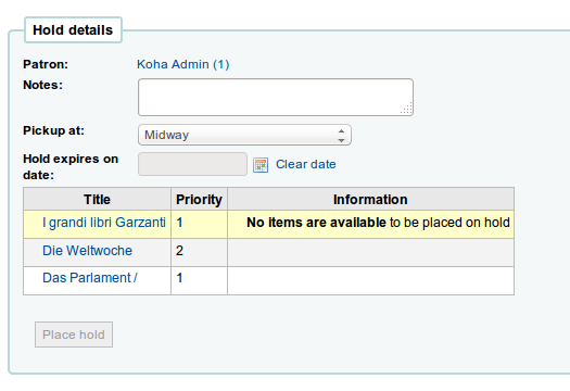 ---- Reported by nengard@gmail.com 2010-02-23 17:15:25 ---- When placing a hold on multiple items in the staff client if one of the items can't have a hold placed on it then you can't place a hold on any of them. You should be able to place a hold on the items that do allow holds without going back and choosing the items again. --- Bug imported by chris@bigballofwax.co.nz 2010-05-21 01:24 UTC --- This bug was previously known as _bug_ 4249 at http://bugs.koha.org/cgi-bin/bugzilla3/show_bug.cgi?id=4249 Actual time not defined. Setting to 0.0 Setting qa contact to the default for this product. This bug either had no qa contact or an invalid one.