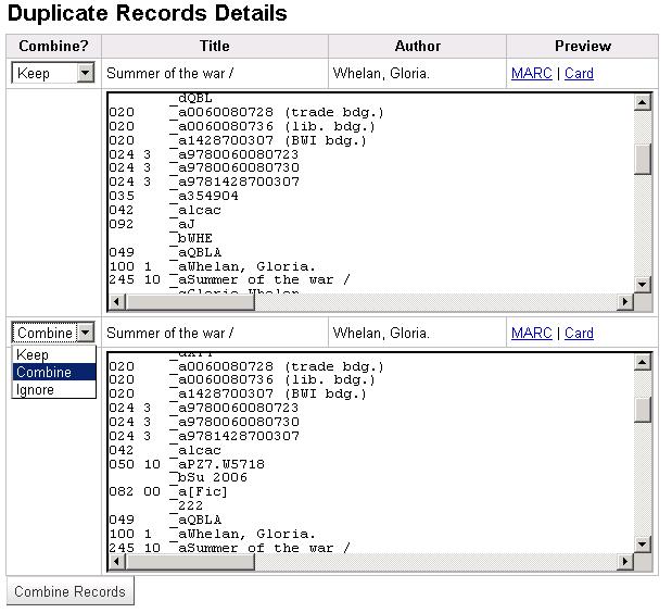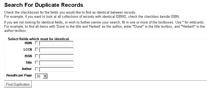 ---- Reported by jwagner@ptfs.com 2010-02-26 17:03:29 ---- Created an attachment Screen shot of initial bib merge feature setup Sponsored by East Brunswick Public Library, East Brunswick, NJ, USA and Middletown Public Library, Middletown, NJ, USA. Allows users to search for duplicate bib records by ISBN, LCCN, ISSN, Title, or Author. You can either search for all duplicates (by using the checkbox) or a particular duplicate (by entering a search term with an * wildcard, like Rowling* or Harry Potter and*). If results are found, the feature displays the MARC record for all possible duplicates. A pulldown box lets the user select which record to keep (retaining that MARC data), combine (transfer items to the Keep title), or ignore (don't combine). Note that the feature does not allow merging MARC fields from one title to another; it just transfers the items. ---- Additional Comments From jwagner@ptfs.com 2010-02-26 17:03:56 ---- Created an attachment Screen shot of search results ---- Additional Comments From jwagner@ptfs.com 2010-02-26 17:04:28 ---- Created an attachment Screen shot of combine screen ---- Additional Comments From paul.poulain@biblibre.com 2010-03-05 09:05:11 ---- jane : isn't this a duplicate of : http://git.koha.org/cgi-bin/gitweb.cgi?p=Koha;a=blob;f=cataloguing/merge.pl;h=63980168edfd886045638ecba40c032bfbdc110f;hb=HEAD ? ---- Additional Comments From jwagner@ptfs.com 2010-03-05 20:22:16 ---- Paul, I think we discussed this online. You're referring to the merge function you've written, that is under the Lists function, correct? Ours is a different approach and I think both can coexist. We may need to see if they can be merged, or would need to be kept separate. --- Bug imported by chris@bigballofwax.co.nz 2010-05-21 01:25 UTC --- This bug was previously known as _bug_ 4283 at http://bugs.koha.org/cgi-bin/bugzilla3/show_bug.cgi?id=4283 Imported an attachment (id=1973) Imported an attachment (id=1974) Imported an attachment (id=1975) Unknown operating system Windows 2000. Setting to default OS "All". Actual time not defined. Setting to 0.0 The original reporter of this bug does not have an account here. Reassigning to the person who moved it here: chris@bigballofwax.co.nz. Previous reporter was jwagner@ptfs.com. The original assignee of this bug does not have an account here. Reassigning to the default assignee for the component, gmcharlt@gmail.com. Previous assignee was kohaprogrammers@ptfs.com. Setting qa contact to the default for this product. This bug either had no qa contact or an invalid one. Bug reassigned, setting status to "NEW". Previous status was "ASSIGNED". CC member jwagner@ptfs.com does not have an account here The original submitter of attachment 1973 [details] is unknown. Reassigning to the person who moved it here: chris@bigballofwax.co.nz. The original submitter of attachment 1974 [details] is unknown. Reassigning to the person who moved it here: chris@bigballofwax.co.nz. The original submitter of attachment 1975 [details] is unknown. Reassigning to the person who moved it here: chris@bigballofwax.co.nz.