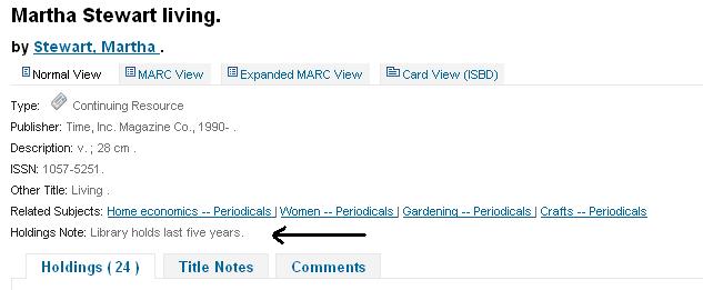 ---- Reported by jwagner@ptfs.com 2010-03-04 19:32:06 ---- Created an attachment Screen shot of OPAC display I had a request to display the 866 subfield z serials summary holdings note in the OPAC, and thought it would be a useful addition. In the attached screenshot, for example, the 866z has an entry of Library holds last five years. In MARC21slim2OPACDetail.xsl, I placed this just above the blocks for the 780 and 785 fields. ---- Additional Comments From gmcharlt@gmail.com 2010-05-11 12:59:58 ---- Patch pushed. Please test and close. ---- Additional Comments From jwagner@ptfs.com 2010-05-12 14:01:57 ---- The fix for this bug (in ptfs-harley) can be pulled from the public git repository at http://github.com/Koha-PTFS, branch http://bugs.koha.org/cgi-bin/bugzilla3/show_bug.cgi?id=4300 ---- Additional Comments From jwagner@ptfs.com 2010-05-12 16:37:52 ---- Seems to be fixed. --- Bug imported by chris@bigballofwax.co.nz 2010-05-21 01:25 UTC --- This bug was previously known as _bug_ 4300 at http://bugs.koha.org/cgi-bin/bugzilla3/show_bug.cgi?id=4300 Imported an attachment (id=1993) Unknown operating system Windows 2000. Setting to default OS "All". Actual time not defined. Setting to 0.0 The original reporter of this bug does not have an account here. Reassigning to the person who moved it here: chris@bigballofwax.co.nz. Previous reporter was jwagner@ptfs.com. The original assignee of this bug does not have an account here. Reassigning to the default assignee for the component, chris@bigballofwax.co.nz. Previous assignee was jwagner@ptfs.com. Setting qa contact to the default for this product. This bug either had no qa contact or an invalid one. The original submitter of attachment 1993 [details] is unknown. Reassigning to the person who moved it here: chris@bigballofwax.co.nz.