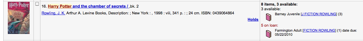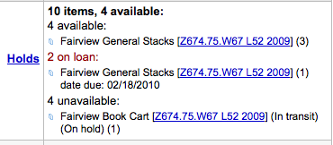 ---- Reported by nengard@gmail.com 2010-05-01 18:22:07 ---- Created an attachment 2 copies showing as 1 See the attached images. When an item has multiple items available it says 2 items available - this is fine - but then it shows the call number and the item and a (1) ... shouldn't that be a (2) for the 2 items? Sometimes it displays properly - but it seems to only show right when there are copy numbers in the records. ---- Additional Comments From nengard@gmail.com 2010-05-01 18:22:53 ---- Created an attachment 5 copies show as 1 but 3 copies show as 3 ---- Additional Comments From nengard@gmail.com 2010-05-01 18:23:40 ---- XSLT Results display is off by the way - since it breaks the OPAC anyway. ---- Additional Comments From nengard@gmail.com 2010-05-03 12:01:10 ---- Created an attachment all kinds of funniness In the attached image you see that there are 4 available but it says (3) next to the call number. Then there are 2 on loan but it says (1). And finally there are 4 unavailable for other reasons but there 2 reasons (in transit) and (on hold) and only (1) as the number. ---- Additional Comments From oleonard@myacpl.org 2010-05-03 13:50:59 ---- *** http://bugs.koha.org/cgi-bin/bugzilla3/show_bug.cgi?id=4431 has been marked as a duplicate of this bug. *** ---- Additional Comments From oleonard@myacpl.org 2010-05-07 18:13:03 ---- Reassigning this bug because it's not the result of a template issue AFAICT --- Bug imported by chris@bigballofwax.co.nz 2010-05-21 01:27 UTC --- This bug was previously known as _bug_ 4430 at http://bugs.koha.org/cgi-bin/bugzilla3/show_bug.cgi?id=4430 This bug depended on bug(s) 2142. Imported an attachment (id=2092) Imported an attachment (id=2093) Imported an attachment (id=2094) Actual time not defined. Setting to 0.0 Setting qa contact to the default for this product. This bug either had no qa contact or an invalid one. The original submitter of attachment 2092 [details] is unknown. Reassigning to the person who moved it here: chris@bigballofwax.co.nz. The original submitter of attachment 2093 [details] is unknown. Reassigning to the person who moved it here: chris@bigballofwax.co.nz. The original submitter of attachment 2094 [details] is unknown. Reassigning to the person who moved it here: chris@bigballofwax.co.nz.