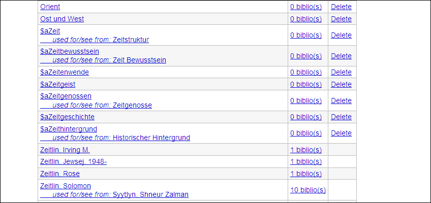 It looks like the code to remove the subfield tags was purposely commented out and replaced with an as_formatted() function in AuthoritiesMarc.pm. The code assigns value to the 'summary' variable. Currently lines 1059 and 1060 in AuthoritiesMarc.pm. # $heading .= $field->as_string('abvxyz68'); $heading .= $field->as_formatted(); I'm not sure for what purpose. Only the 150 field has been changed. as_formatted creates 'pretty' marc for printout purposes. If you remove the comment from the as_string line and comment out the as_formatted line the authorities display correctly, but I'm not sure if it breaks something else.