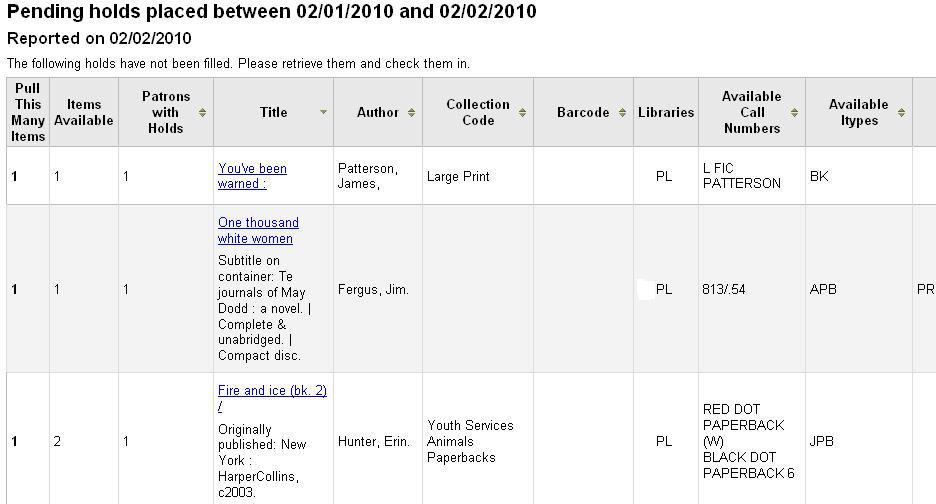 ---- Reported by jwagner@ptfs.com 2010-05-12 14:34:54 ---- Created an attachment screen shot of holds to pull changes We have made some improvements to the holds to pull report, adding author, collection code, and (when item-specific hold) barcode to the output. ---- Additional Comments From jwagner@ptfs.com 2010-05-12 14:35:26 ---- The fix for this bug (in ptfs-harley) can be pulled from the public git repository at http://github.com/Koha-PTFS, branch PTFS_holdstopull --- Bug imported by chris@bigballofwax.co.nz 2010-05-21 01:27 UTC --- This bug was previously known as _bug_ 4493 at http://bugs.koha.org/cgi-bin/bugzilla3/show_bug.cgi?id=4493 Imported an attachment (id=2129) Unknown operating system Windows 2000. Setting to default OS "All". Actual time not defined. Setting to 0.0 The original reporter of this bug does not have an account here. Reassigning to the person who moved it here: chris@bigballofwax.co.nz. Previous reporter was jwagner@ptfs.com. The original assignee of this bug does not have an account here. Reassigning to the default assignee for the component, gmcharlt@gmail.com. Previous assignee was kohaprogrammers@ptfs.com. Setting qa contact to the default for this product. This bug either had no qa contact or an invalid one. Bug reassigned, setting status to "NEW". Previous status was "ASSIGNED". CC member jwagner@ptfs.com does not have an account here The original submitter of attachment 2129 [details] is unknown. Reassigning to the person who moved it here: chris@bigballofwax.co.nz.