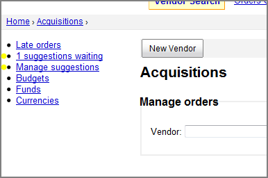 Created attachment 2573 [details] [review] Proposed fix - Removing 'suggestions waiting' link from left-hand menu. A plain 'suggestions' link is still shown if suggestions are enabled. - Putting back the 'pending suggestions' box that used to appear on the Acquisitions home page. This will show, with a count of pending suggestions, only if suggestions are turned on and there are pending suggestions.