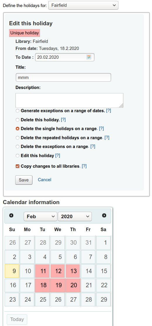 Hi Emmi, I have the same issue as Katrin. This scenario works: - Add single holiday on a range and copy to all libraries - Use 'delete this holiday' to delete one day from the range and copy to all libraries As does this: - Add repeated holiday on a range and copy to all libraries - Use 'delete this holiday' to delete one day from the range and copy to all libraries But this doesn't work: - Add single holiday on a range and copy to all libraries - Use 'delete the single holidays on a range' to delete multiple or all days from the range and copy to all libraries Nor does this: - Add repeated holiday on a range and copy to all libraries - Use 'delete the repeated holidays on a range' to delete multiple or all days from the range and copy to all libraries