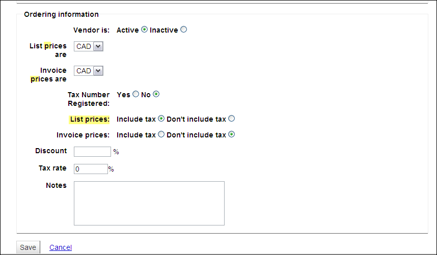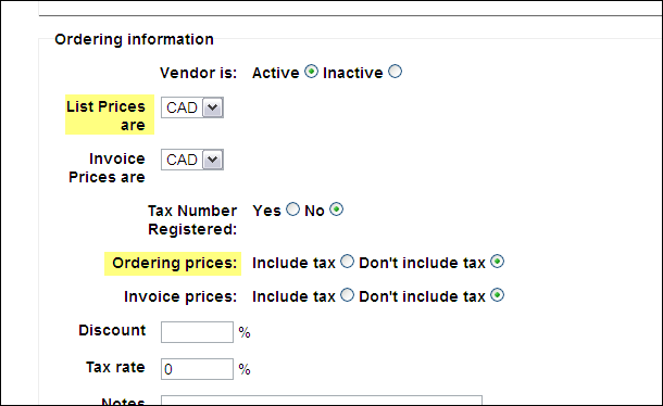 Created attachment 2420 [details] screenshot of new vendor form The vendor form uses the terms list price for currency and ordering price for tax information. After discussion in IRC we came to the conclusion that both terms have the same meaning. 07-26-2010 (12:16:19) chris: i think in the context of the vendor form its the same (12:16:25) chris: thats how the code uses it anyway (12:17:09) chris: it will use the currency chosen to convert the price, then if there is tax then subtract that, then remove the discount (12:18:29) chris: to end up with the estimated cost, so the currency of list price and tax of ordering price are both used for the same thing