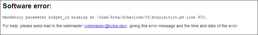 Created attachment 2423 [details] screenshot of error message AcqCreateItem : Create item when placing an order. Koha version: 3.01.00.145 If you add an order without adding funds and budgets first, you get a perl error message when you try to safe your order. The form should check if a budget was chosen and show a nice error message. I was not sure if this bug is perhaps related to bug 3616.