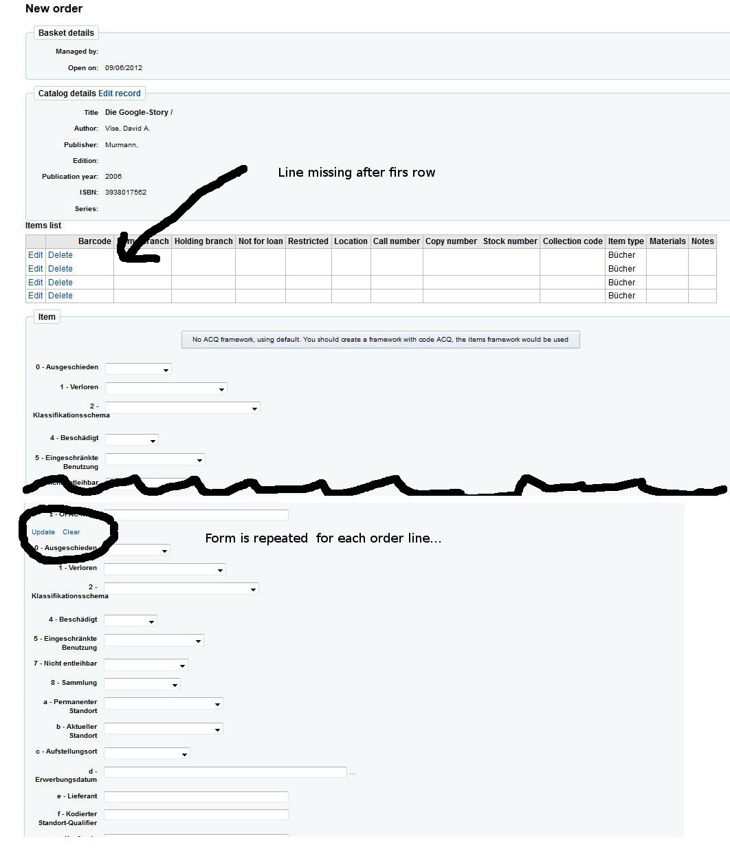 Katrin and I found a bug while testing the patch during Kohacon 12 Hackfest. If you add new items to a basket, the form "Item" is rpeated several times. We double checked with and without patch applied and with and without ACQ framework defined. Additionally, in the Items list table we had a line missing between the first and the second item. See screenshot attached. ---------------- We found a misspelling in koha-tmpl/intranet-tmpl/prog/en/modules/admin/preferences/acquisitions.pref If you want more than 1 value, please separe with |) should read If you want more than 1 value, please separate with |) ---------------- We found several Bugs on Bugzilla that probably could be related to or resolved by this one: Bug 7495 - Tax calculations problem for new orders. Bug 7686 - Tax rate wrong calculation in reception summary page Bug 6965 - Tax and dicount rate should be formatted the same Bug 3980 - Vendor GST being ignored