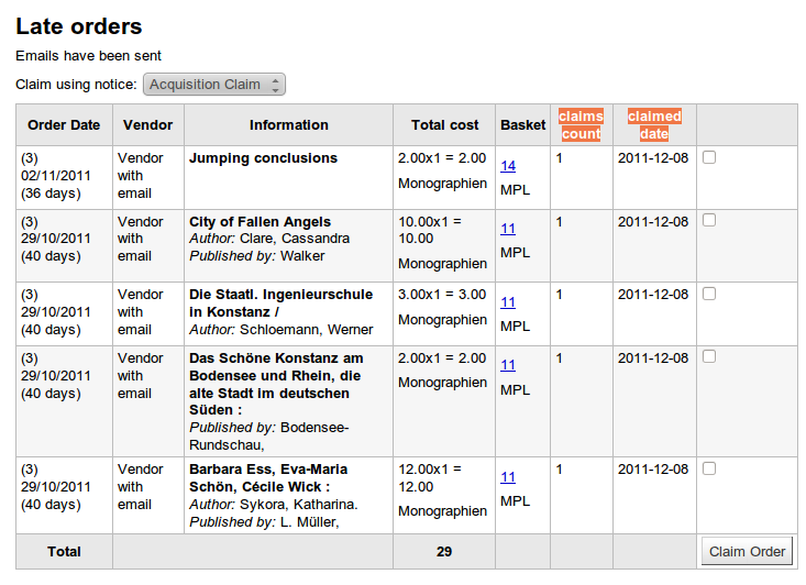 3) The corrected default notice will not output a list: ACQCLAIM Ordernumber <<aqorders.ordernumber>> (<<biblio.title>>) (<<aqorders.quantity>> ordered)($<<aqorders.listprice>> each) has not been received. Email: Ordernumber 10 (City of Fallen Angels) (1 ordered)($10.00 each) has not been received. Using that works better: ACQCLAIM <item>Ordernumber <<aqorders.ordernumber>> (<<biblio.title>>) (<<aqorders.quantity>> ordered)($<<aqorders.listprice>> each) has not been received.</item> I think the <item> tags (or another tag, see 4) ) should be added to the notices too. Email: Ordernumber 10 (City of Fallen Angels) (1 ordered)($10.00 each) has not been received. Ordernumber 11 (Die Staatl. Ingenieurschule in Konstanz /) (1 ordered)($3.00 each) has not been received. 4) I think using the <item> tag here might be confusing, because people expect a list of items instead of records. Perhaps it would be better to use <title> or <record> or <biblio>? Sorry for not spotting those things earlier :(