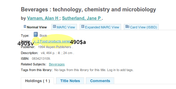 Created attachment 2751 [details] Explanatory picture For the 490 MARC field, the 'a' is the series statement and 'v' is the volume number. When displaying details on a biblio, Koha will display any fields in 490 in the order they are in the MARC file, rather than being smarter and making sure 'a' comes before 'v'. See the screenshot. This applies to the XSLT and non-XSLT views, in both the OPAC and the staff client. Note that the link creation only applies to the 'a' field, so it's not causing breakage.
