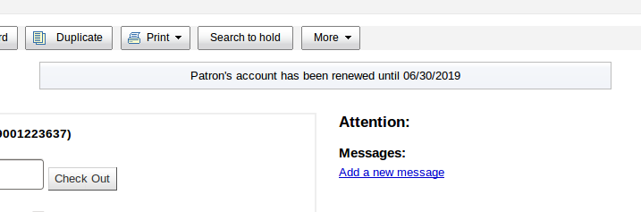 Sorry, I'm seeing the same as Nicole and Guillaume. I did a "git checkout origin/new/awaiting_qa/bug_5436", then did a specific search for a patron, which took me straight to the details tab for that patron (great!). But when I click on the "Check out" tab I see the message "Patron's account has been renewed until 06/30/2019". When I click on "Details" and then on "Check out" again the same message is still displayed. Doing "git checkout master" and clicking on the "Check out" tab removes the message. Confirming failed QA. BTW: This would have been so much easier to test if each separate feature/fix had it's own separate bug/patch. And this thing with the renewed-message would not be blocking all the other bits.