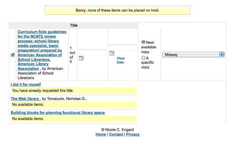 Created attachment 2964 [details] batch holds I'm trying to place a batch of holds and the error message at the top says I can't place holds on any of the items, but there is one item that has the option to place a hold (visually) - that one item however is checked out to the patron already, so it shouldn't be allowed to be placed on hold (I don't think). So basically the error message is right, but one of the items that can't be put on hold is still allowing holds. See attached. I need someone to test this further to confirm that it's an error and what's causing it. Also CCing Owen because the errors highlighted in yellow should probably go all the way to the end of the box - they look a bit short/funny now.